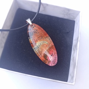 - Anyaga: epoxigyanta, alkohol ink, fekete viaszolt szál, orvosi fém szerelék, szilikonvég, nemesacél medálakasztó, pigmenttinta