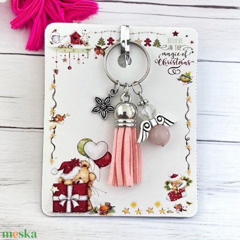 Rózsakvarc ásvány angyal rózsaszín bojttal virággal kulcstartó ajándék táskadísz karácsony ajándékozásra kész