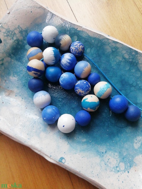 Kézzel készített hosszú kék mintás festett fa nyaklánc-KIFUTÓ TERMÉK