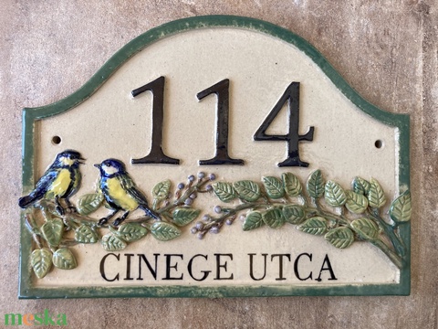 Bajusz formájú házszámtábla széncinkékkel, ággal