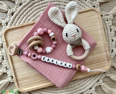Egyedi, minőségi cumilánc és marokrágcsa szett, horgolt nyuszival és muszlinkendővel, díszdobozban.