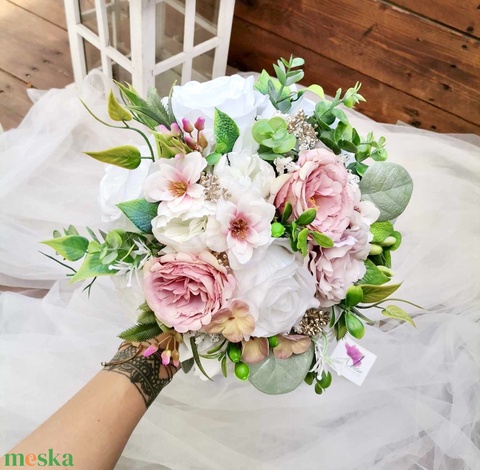 Pasztell Menyasszonyi csokor örök, csokor örökcsokor, fehér rózsa latte csokor
