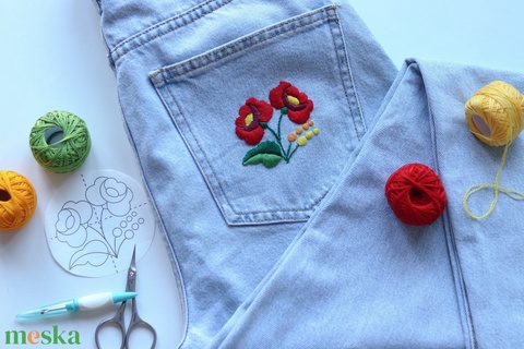 Egyszerű használat: Helyezd a tapaszt a kívánt helyre a textílián. Hímezd ki a mintát akár a kalocsai színszabályokat követve, akár a saját színeiddel és kedvenc hímző technikáiddal.