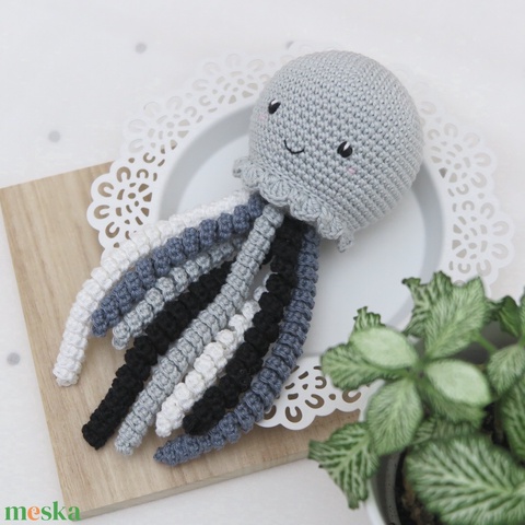 Horgolt világosszürke polip, monokróm (csörgővel is kérhető)
