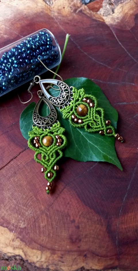 Fűzöld/tigrisszem makramé fülbevaló