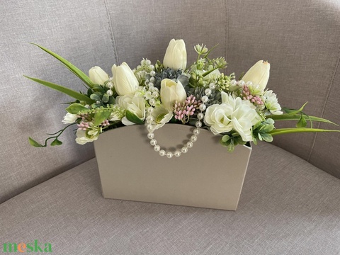 Tulipános asztali virágdísz gyöngyös kosárkában