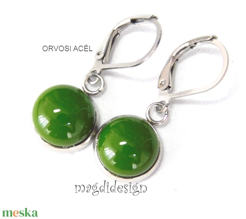 NEMESACÉL! Borsózöld üvegékszer lógós nemesacél fülbevaló