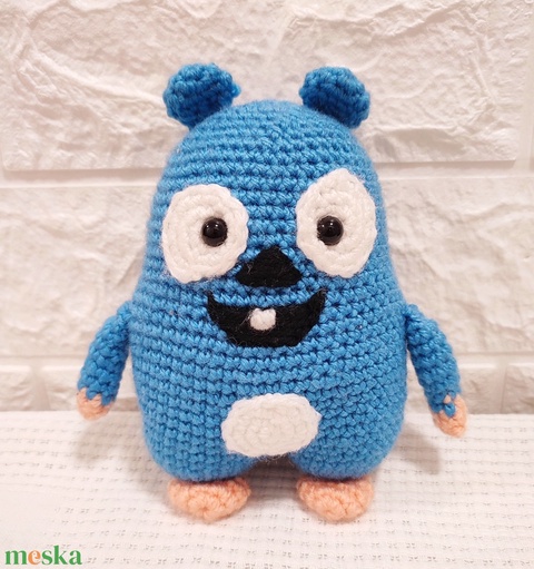 Horgolt, kézműves lemming játékfigura, körülbelül 13 cm.