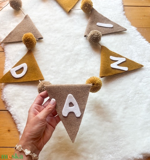 Névre szóló pompom zászlófüzér gyapjúfilcből, gyapjúfonalból készült pompomokkal (név nélkül is kérheted)