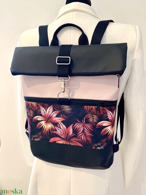 Rolltop Fekete-rózsaszín elegáns pálmalevél mintás-Vízálló-Hátizsák-Hátitáska