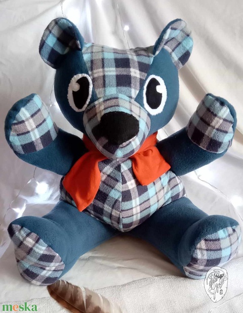 - Anyaga: sötétkék polár, kék kockás ing anyag, poliészter tömés