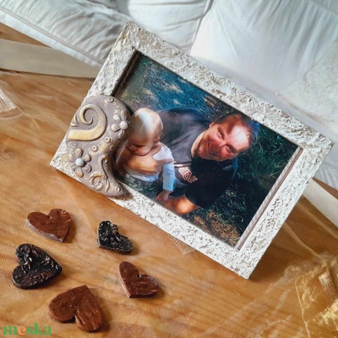 A többfunkciós fénykép- és idézettartó képkeretet Paverpol technikával készítettem. A terméket egy barna csepp formájú, sajátkezűleg készített gyurmadíszítés dobja fel.