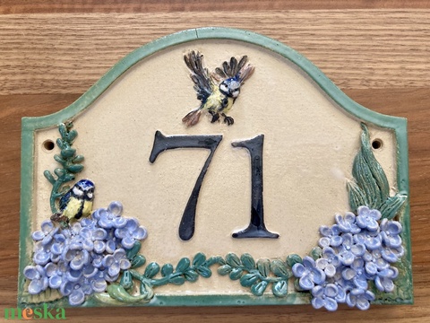 Bajusz formájú házszámtábla széncinkékkel, hortenziával, 71-s számmal