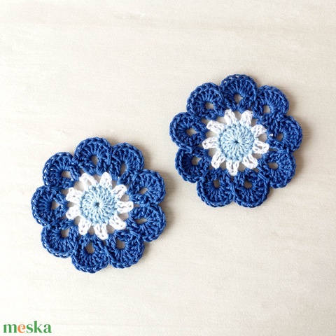 2 db virág alakú horgolt poháralátét, kék-fehér-világoskék