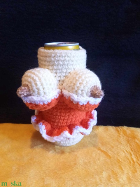Vagány bögyös sörös- Horgolt cici ruha sörös dobozra