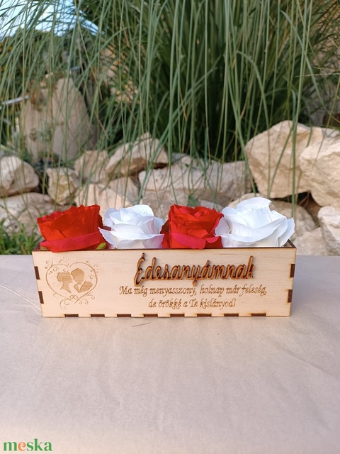 Szülőköszöntő virágbox 4 nagyfejű selyemrózsával ifjú pár3