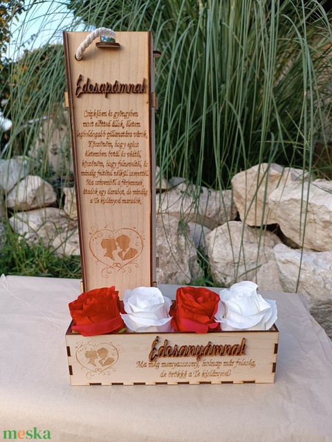 Szülőköszöntő szett, virágbox 4 nagyfejű selyem rózsával és bortartó ifjú pár2