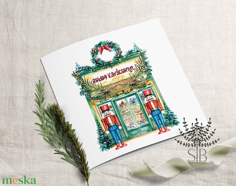 Karácsonyi képeslap színes diótörő játékbolt grafikával