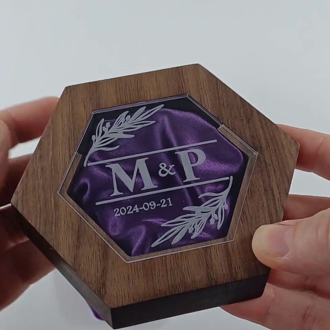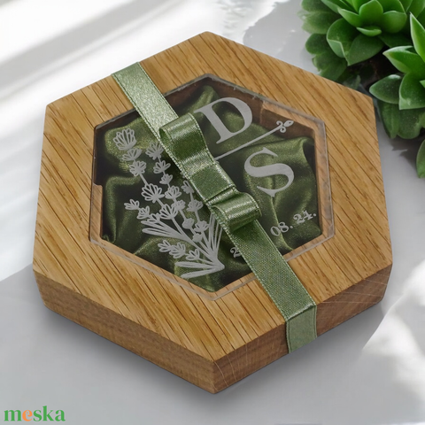 Gyűrűtartó doboz zöld kiegészítőkkel esküvőre, tömör fa ékszertartó átlátszó tetővel, egyedi felirattal