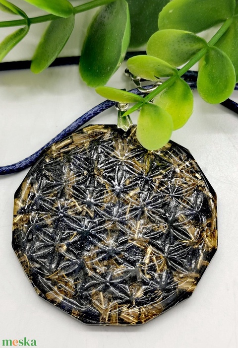 Nagy kerek Orgonit-sungit medál élet virága , kék homokkővel bronzforgáccsal,rézspirállal