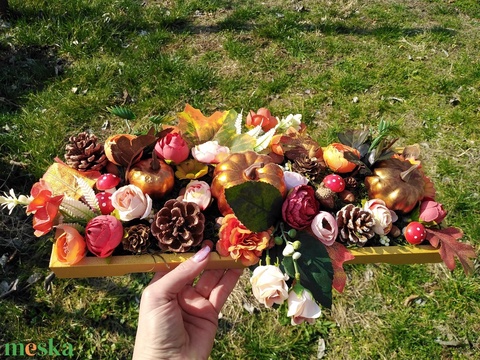- Anyag/Összetevő selyem virág, fa tálca, moha, toboz