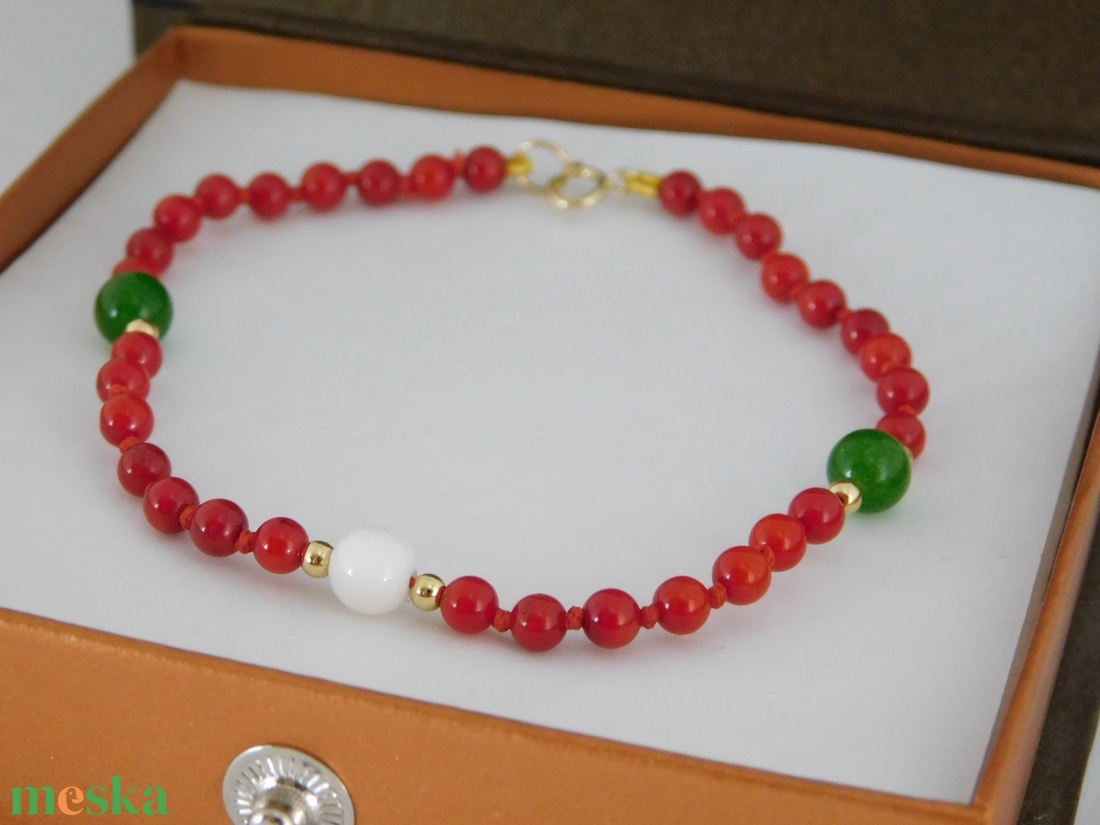 Gyönyörű, egyedi, színes, finom ékszer. Szép, kerek felület. Egyenként csomózott kövek. Méretek: 4.5 mm-es vörös korallok, 6mm-es fehér korallok és 6mm-es jade kövek.