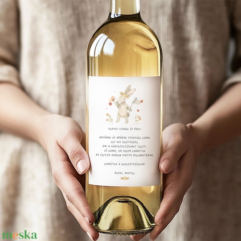 Imádnivaló nyuszival illusztrált keresztszülő felkérő palack címke, mely egy oldalt színesen nyomtatott matt öntapadós papír matricára készül, bármilyen ajándékra könnyen rá tudod ragasztani.