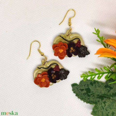 Őszi hangulatú, sütőtök alakú, térbeli virágokkal díszített fülbevaló