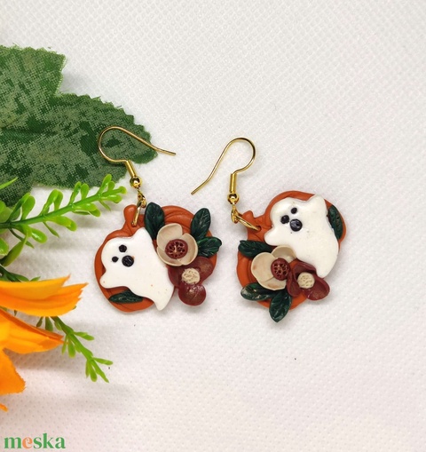 Őszi hangulatú, sütőtök alakú, apró szellemmel és térbeli virágokkal díszített fülbevaló
