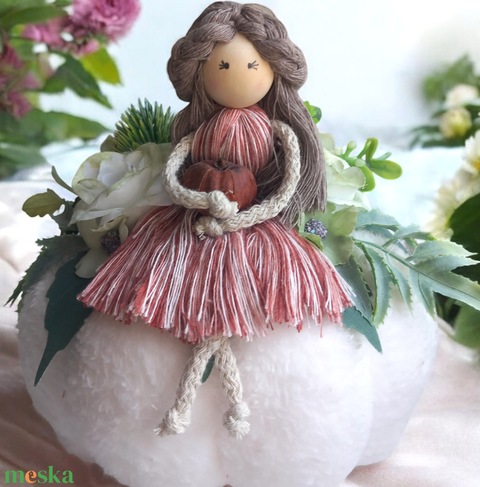 Makramé baba tökön – Őszi asztali dekoráció élethű virágokkal, fehér-zöld-bordó színekben