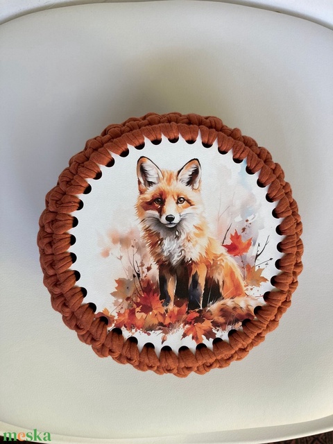 Horgolt kosár, tároló fa alappal, róka mintás tetővel