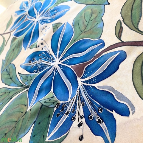 Kék liliomos beige kézzel festett selyemkendő sál