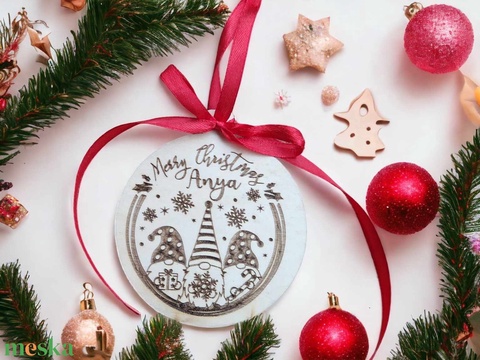 Fa karácsonyfadísz manós motívummal és gravírozható névvel