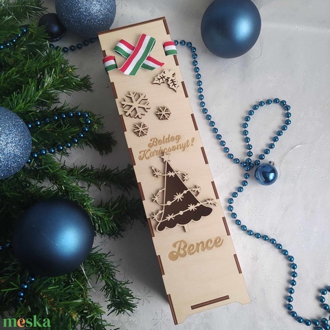 Fa boros doboz karácsonyi díszítéssel, nemzeti színű szalaggal