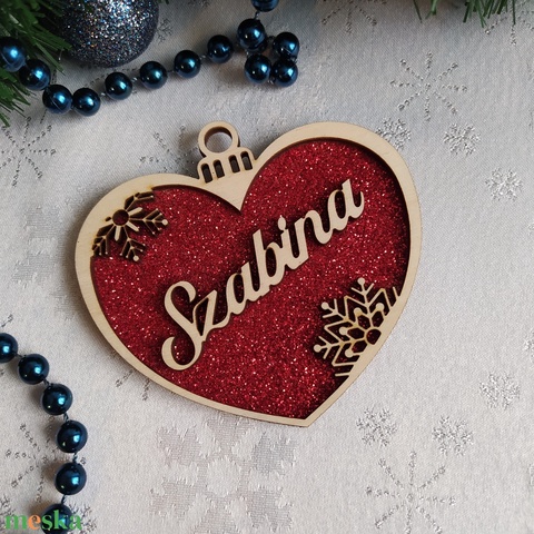Neves, csillámos, szív alakú karácsonyfadísz