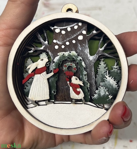 Nyuszikák - Több rétegű kézzel festett karácsonyfadísz fából