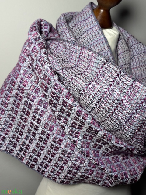 Kézzel Szőtt Lila Merinó Gyapjú és Selyem Kendő, leheletnyi rózsaszínnel
