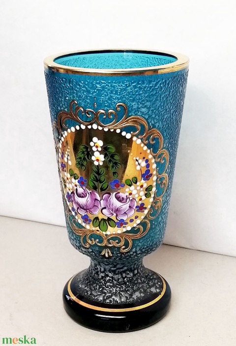 BOHEMIA élénk-kék, stílusos, medalionos pohár biedermeier stílusban