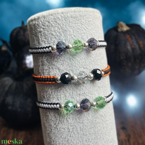 Kísérteties Makramé Karkötő - Halloween színekkel készült csomózott karkötő, színes üveggyöngyökkel, Beetlejuice