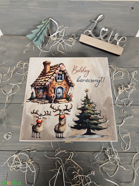 Szarvasok kávés, teás, édességes, italos ajándék díszdoboz karácsonyra