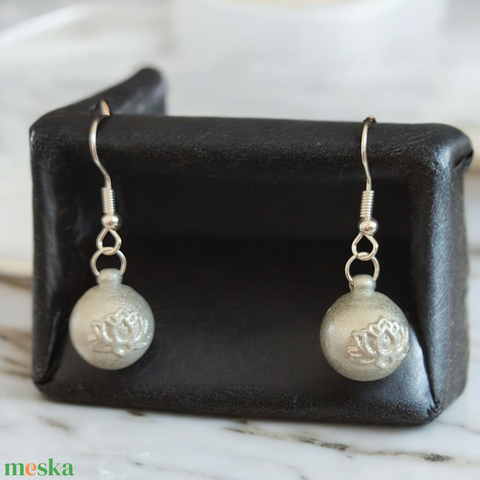 Kis gömb, rajta lótuszvirág, ezüst színben, egyedi lógó fülbevaló + hozzávaló tartóval