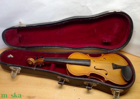 Miniatűr hegedű eredeti tokjában, hiányos felújításra szorul