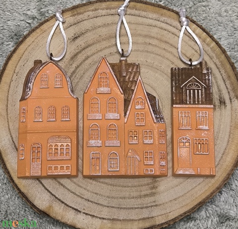 Házikó karácsonyfadíszek narancs-barna- bronz színekben