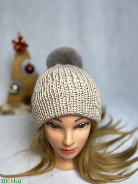 Bézs Kötött Merino Gyapjú Sapka levehetö pompommal