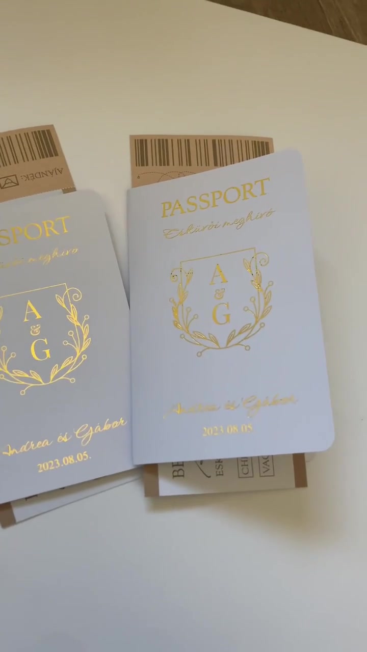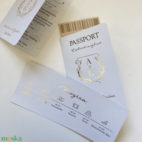 Passport stílusú beszállókártyás fehér-arany esküvői meghívó