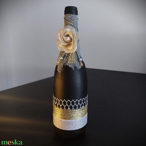 üveg, akril festék, dekorlakk, arany színű zsinór, ezüst színű dekorháló, dekorvirág