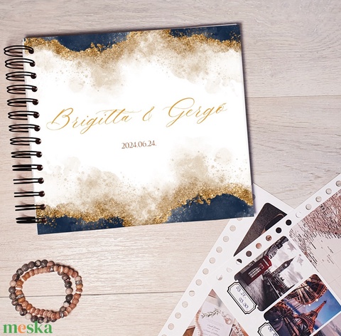 Kék - arany, márvány esküvői vendégkönyv, emlékkönyv, egyedi album, esküvői emlék, füzet, napló, névre szóló