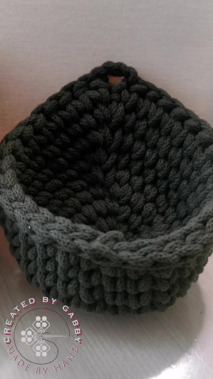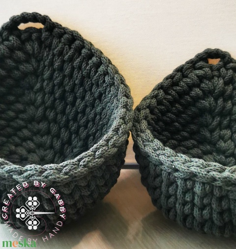 Eladó a képen látható saját kézzel készült horgolt tároló kosárka. Akasztós így praktikusan akasztható fürdőben vagy szobában virágnak is. A kicsi 15 cm, a nagy 17 cm széles, sötét olíva zöld színben. 5000.-/db.