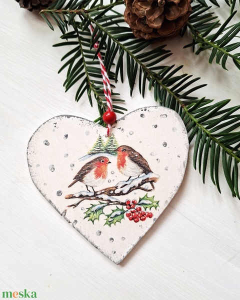 Tél az erdőn- Vörösbegyek- karácsonyi szívecske, függődísz, dekoráció