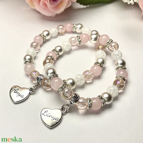 Többféle ásványokból készítettük a páros karkötőt. A lánya karkötő kisebb méret, 15,5-16 cm-es csuklóméretre, az anya karkötő 17 cm-es csuklóméretre javasolt. Kérésre tudunk módosítani a méreten. Dupla elasztikus damilra fűztük.